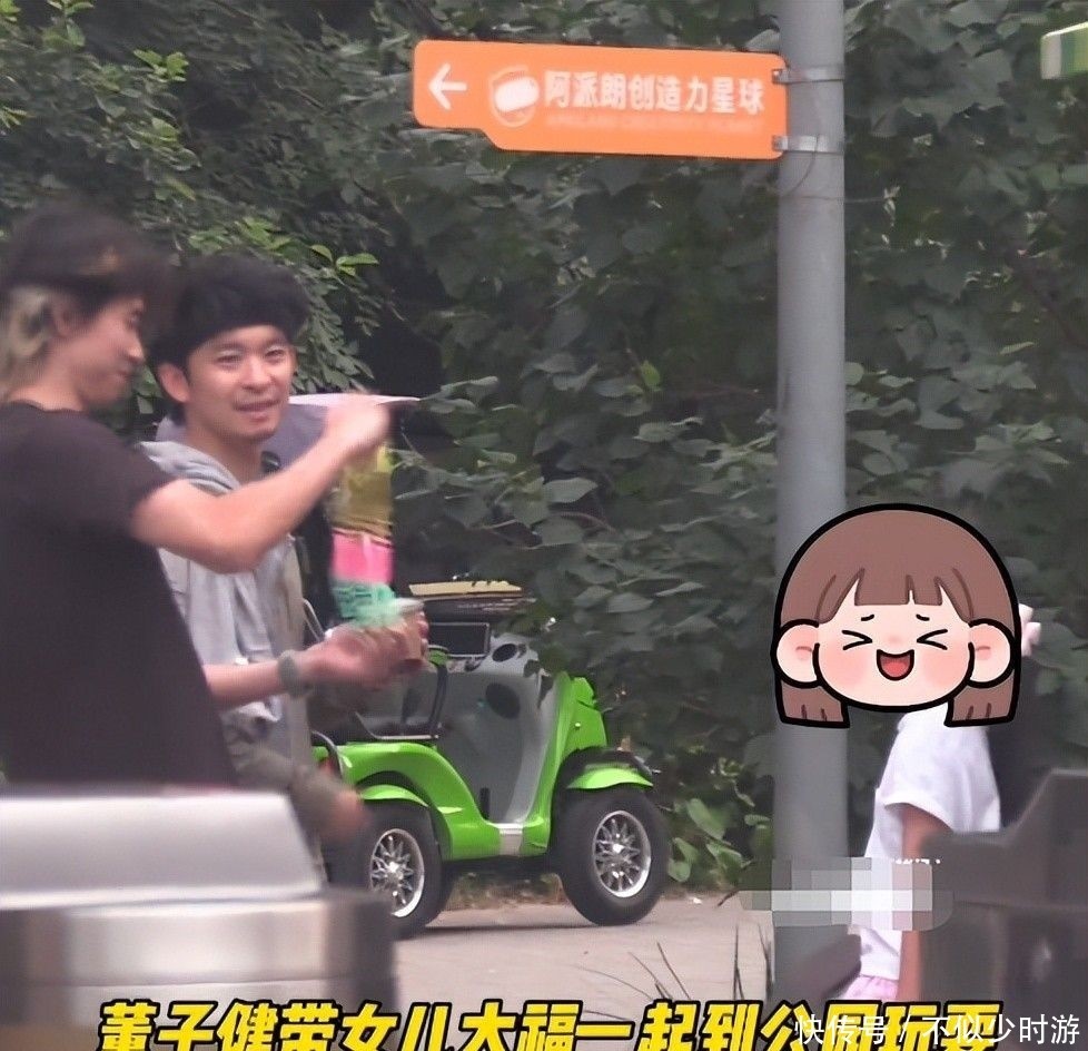 在公园游玩时,朋友还即兴为小女孩表演起了抛接小玩具的杂技,董子健站在一旁看得津津有味,满脸笑意。