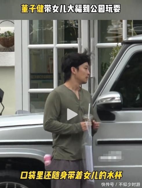 一段视频显示,董子健身穿一件宽松的绿色长袖衬衫,一手端着咖啡,另一手牵着女儿的手,笑容灿烂。